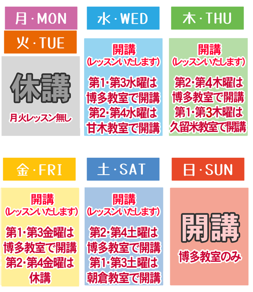 なお久留米教室でのレッスンは第一土曜日と第三土曜日のみです。